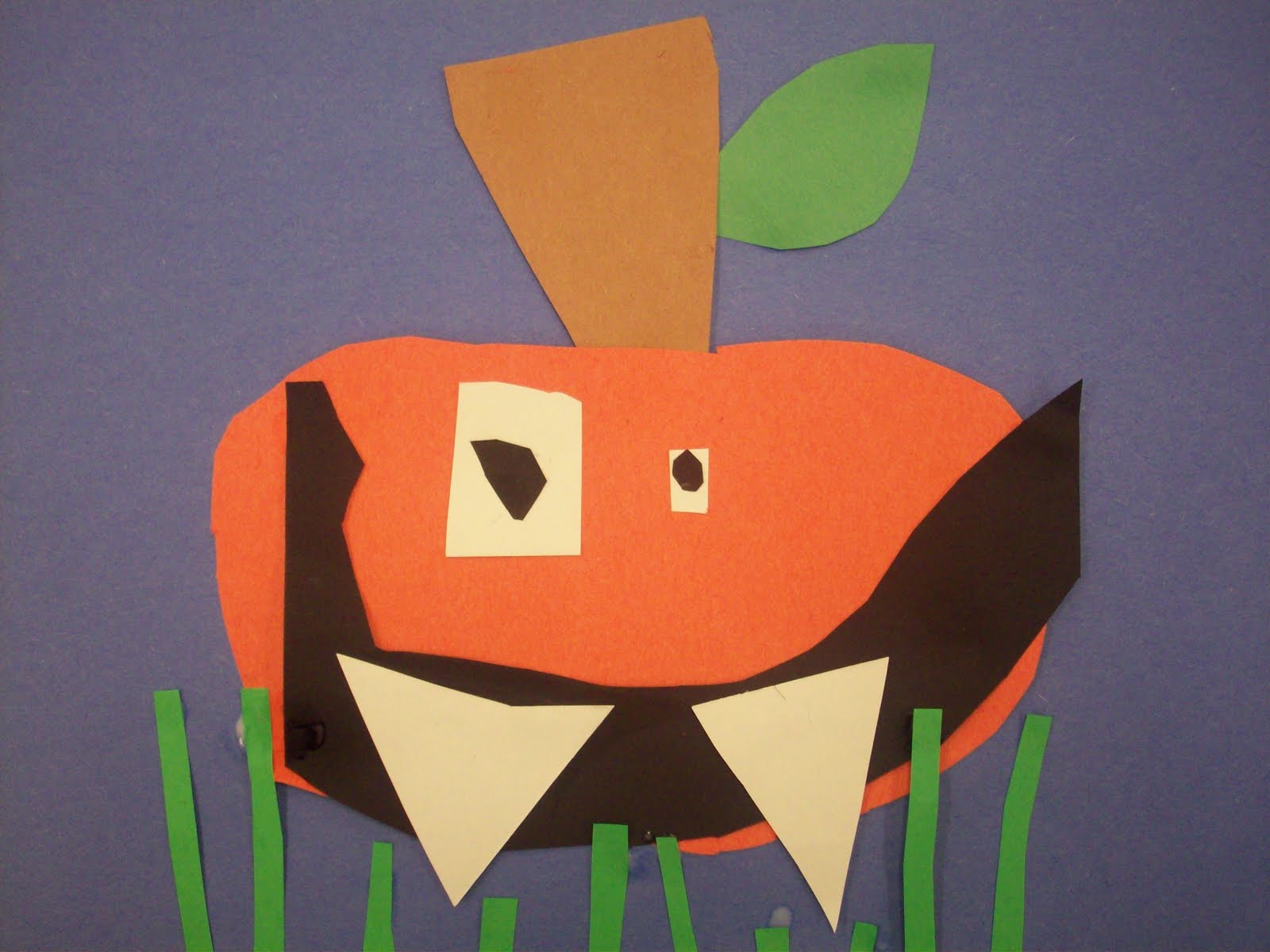 I found this cute idea on Artsonia.com. The trick is to have the students cut out and glue together (no drawing!) a mouth, then teeth, then the pumpkin and so on. Make it a mystery! By the time we got to the circle for the pumpkin, I clued the students in on what we were creating. There was lots of giggling as we saw HUGE mouths glued onto teenie tiny pumpkins. Definitely a hit!